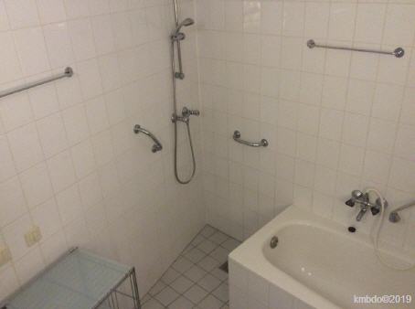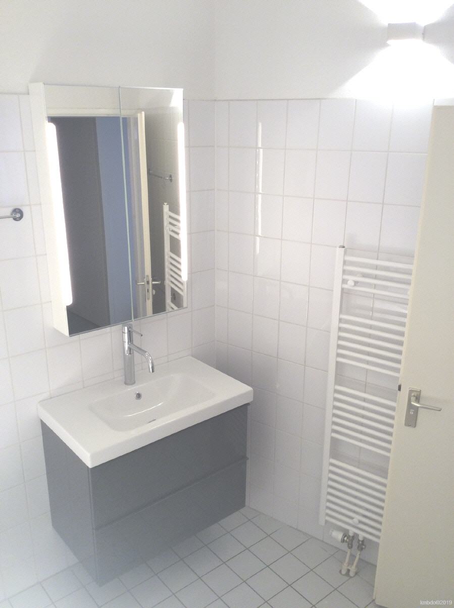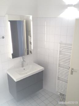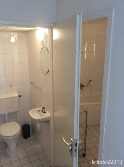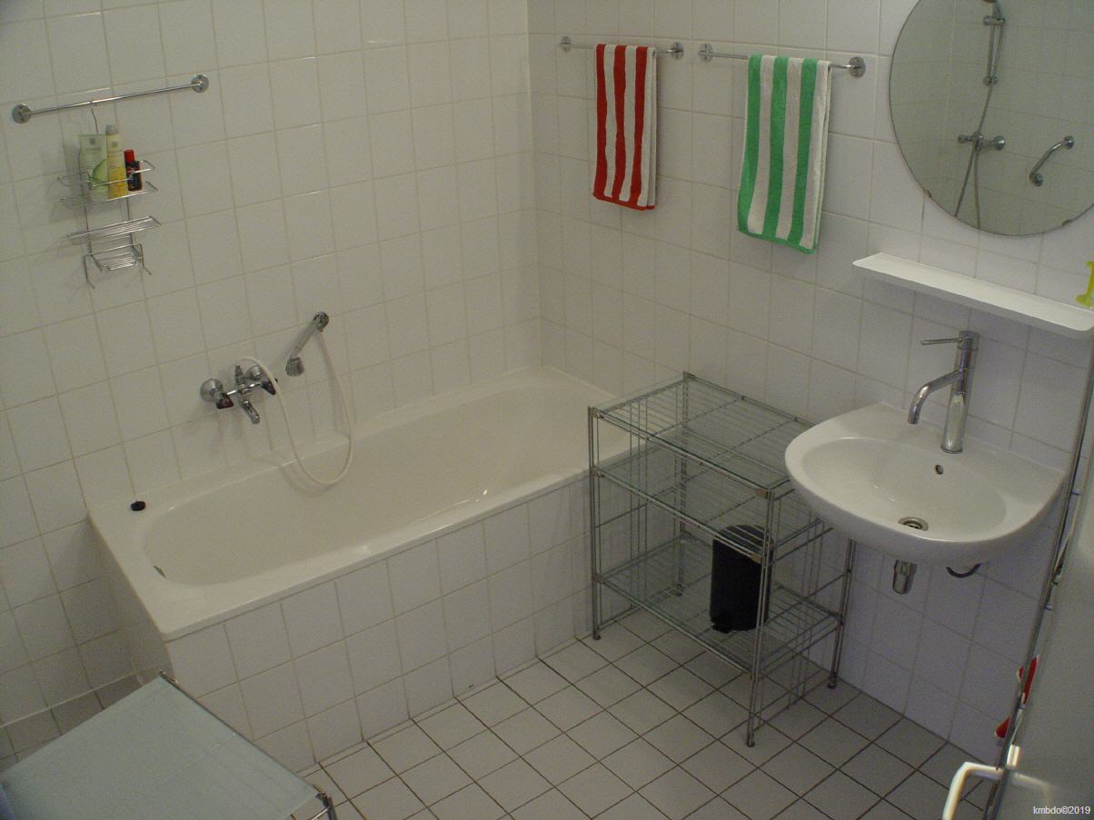 Badezimmer und Toilette (abgetrennter Raum), das Badezimmer wurde bereits renoviert. Bisher wurden unter anderem die alte Heizung ersetzt (und das ehemals dort befindliche Glassregal entfernt) ein Spiegelschrank montiert, Beleuchtung geändert. Im Spiegelschrank befindet sich eine Steckdose für Rasierer, elektrische Zahnbürste und Fön.
